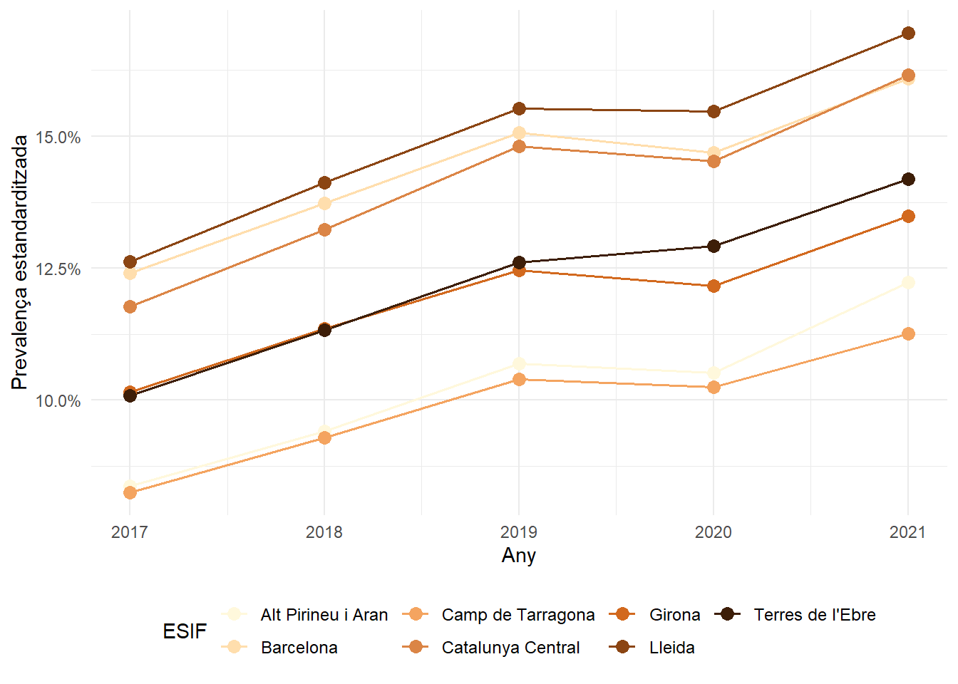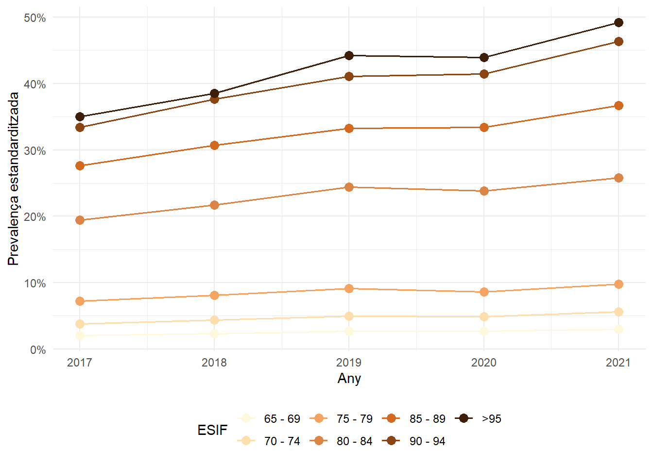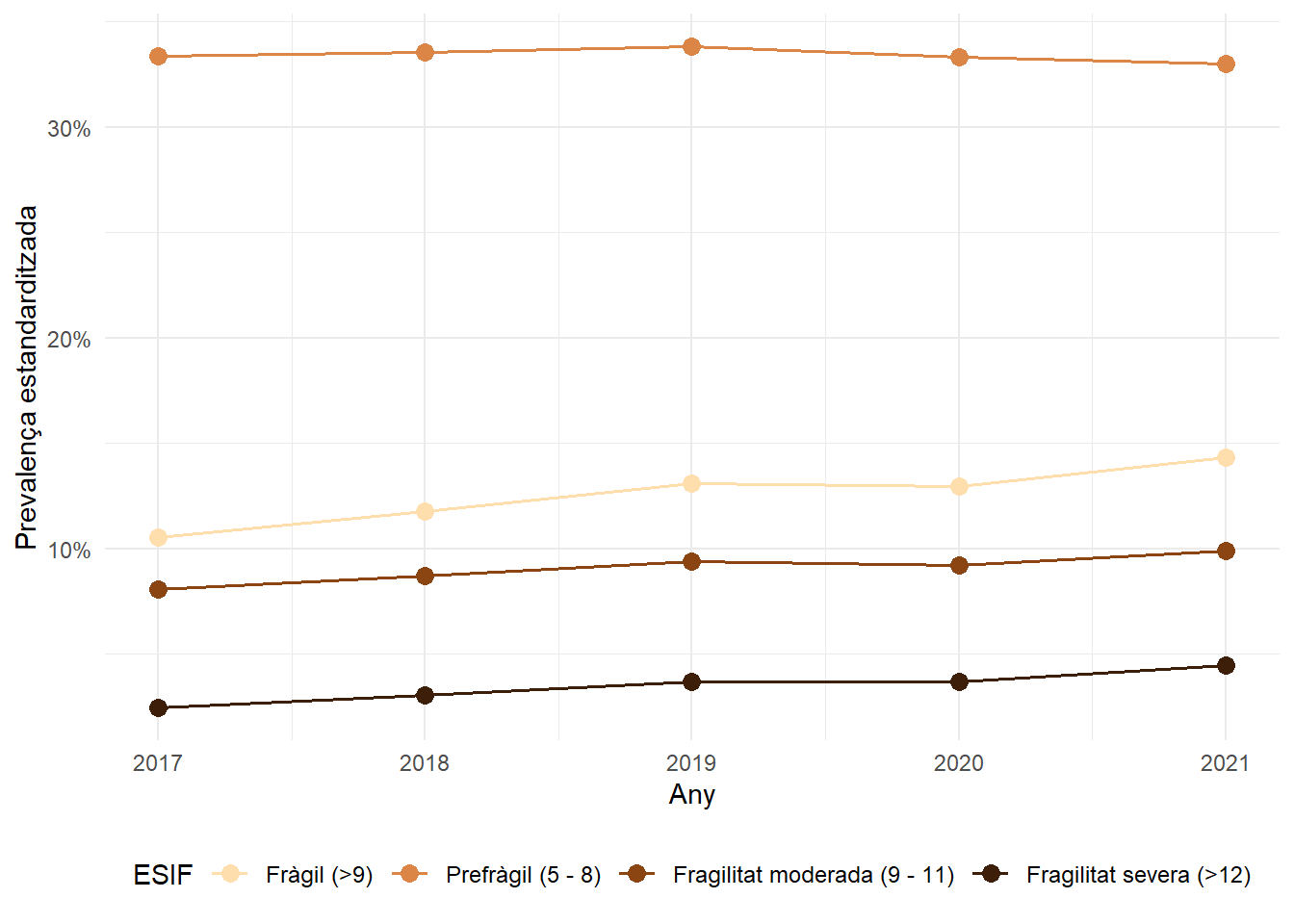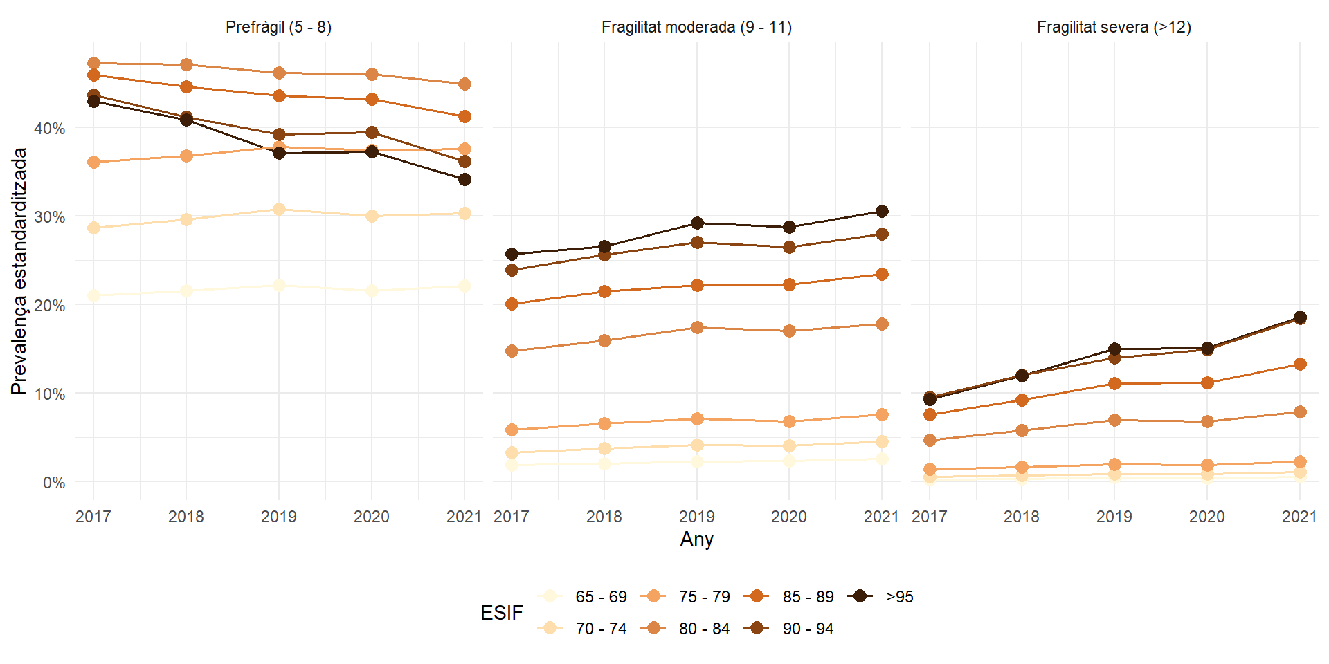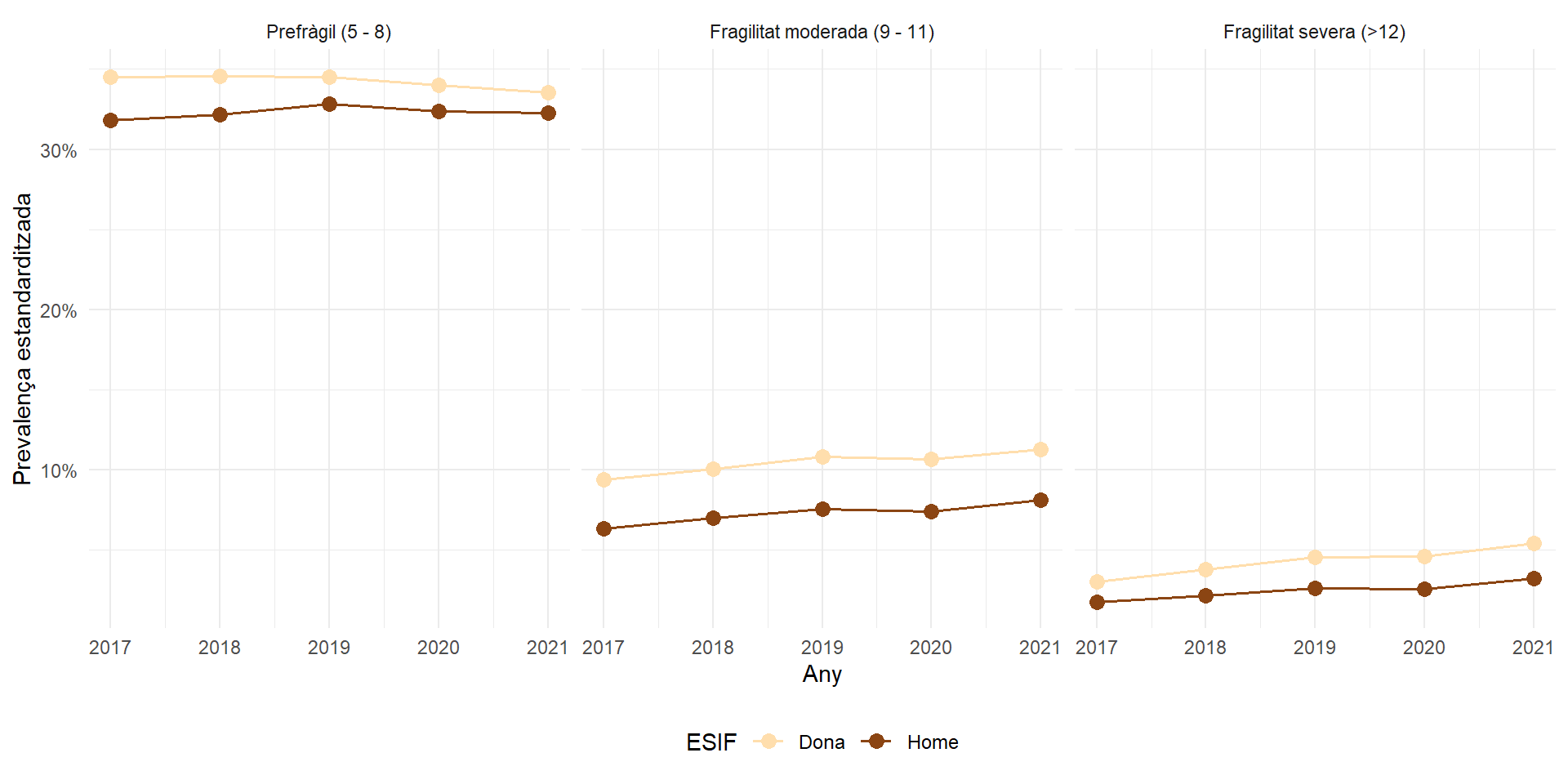 Evolució temporal de la prevalença estandarditzada per edat i sexe en funció dels grups de fragilitat per sexe, edat i Regió Sanitària.